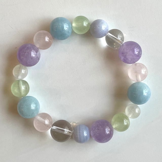 ◆商品説明 パステルカラーの石を集めて シャボン玉ブレスレット○゜ Model 手首周り15㎝ ◆仕様 品番 :No.15223 サイズ :M(手首まわり14~16cm) 石 :アメシスト、アクアマリン、紅水晶、水晶、プレナイト、カルセドニー、ムーンストーン 素材 :シリコンゴム仕立て(太さ1.0mm) 重さ :32g ※納品書、ギフトラッピングの選択がない場合は“選択なし”とさせていただきます。 ※掲載品は、当サイト以外でも展示会等で同時販売しております。販売済みの場合すぐに反映をするよう努めておりますが、ご注文のタイミングによっては売切れとなっている可能性もございます。撮影されている商品は一点物のため、その際には当方の都合によりキャンセルとさせて頂きますこと何卒ご了承ください。