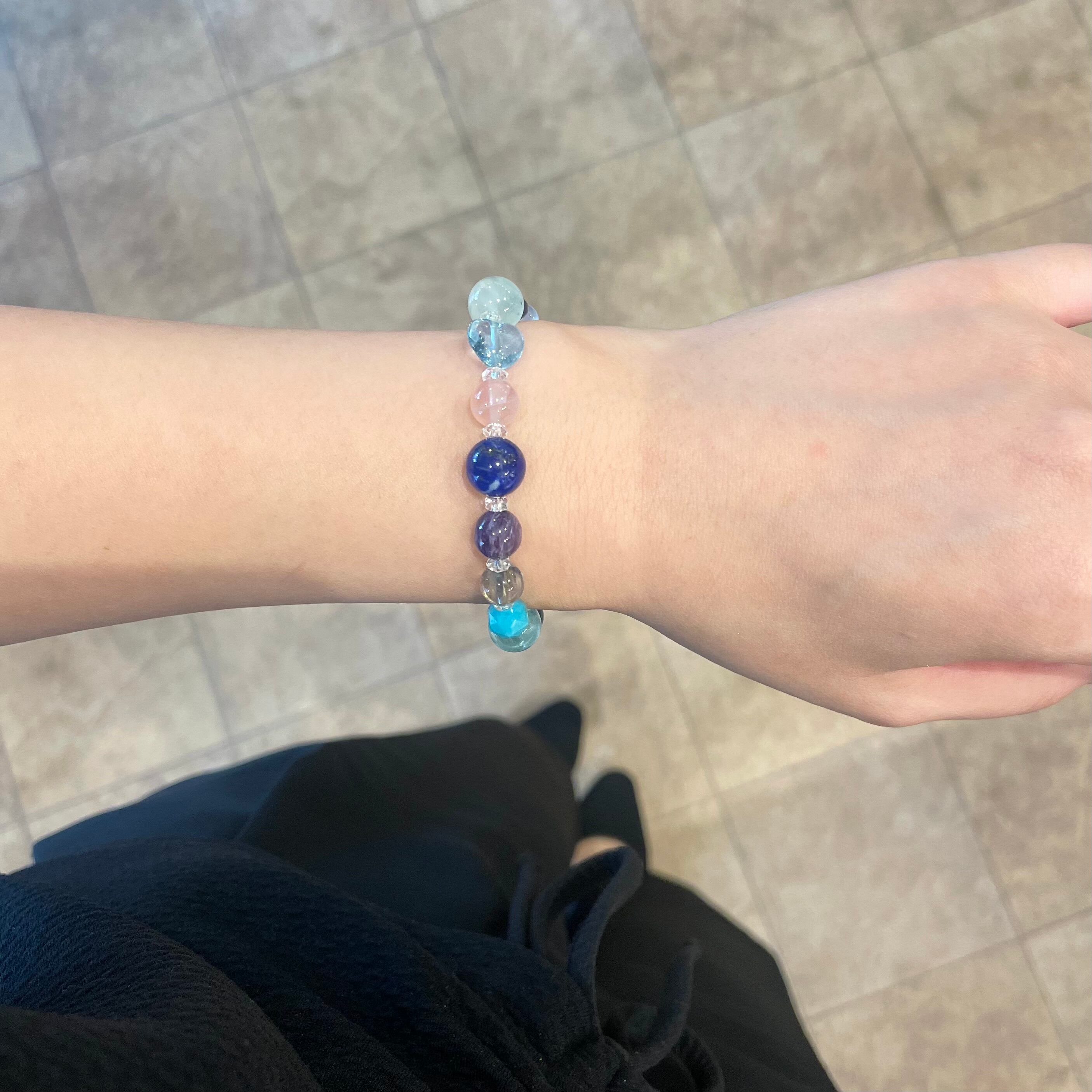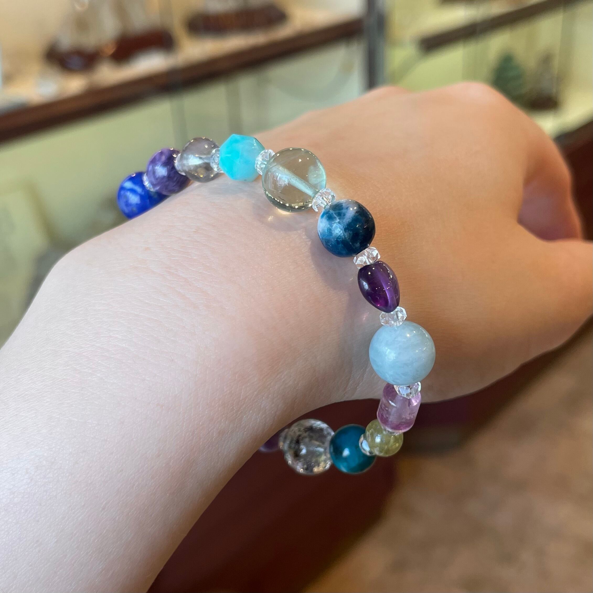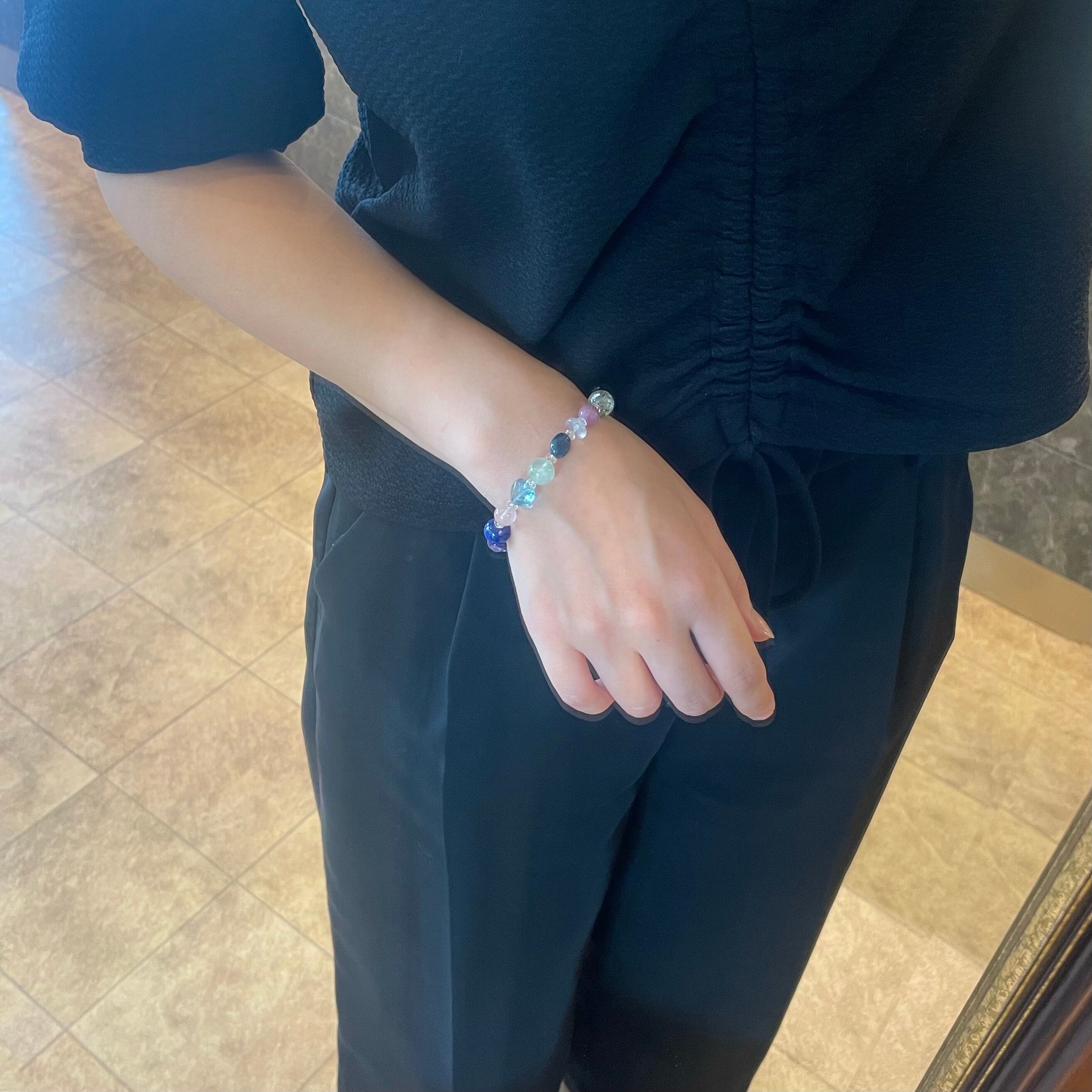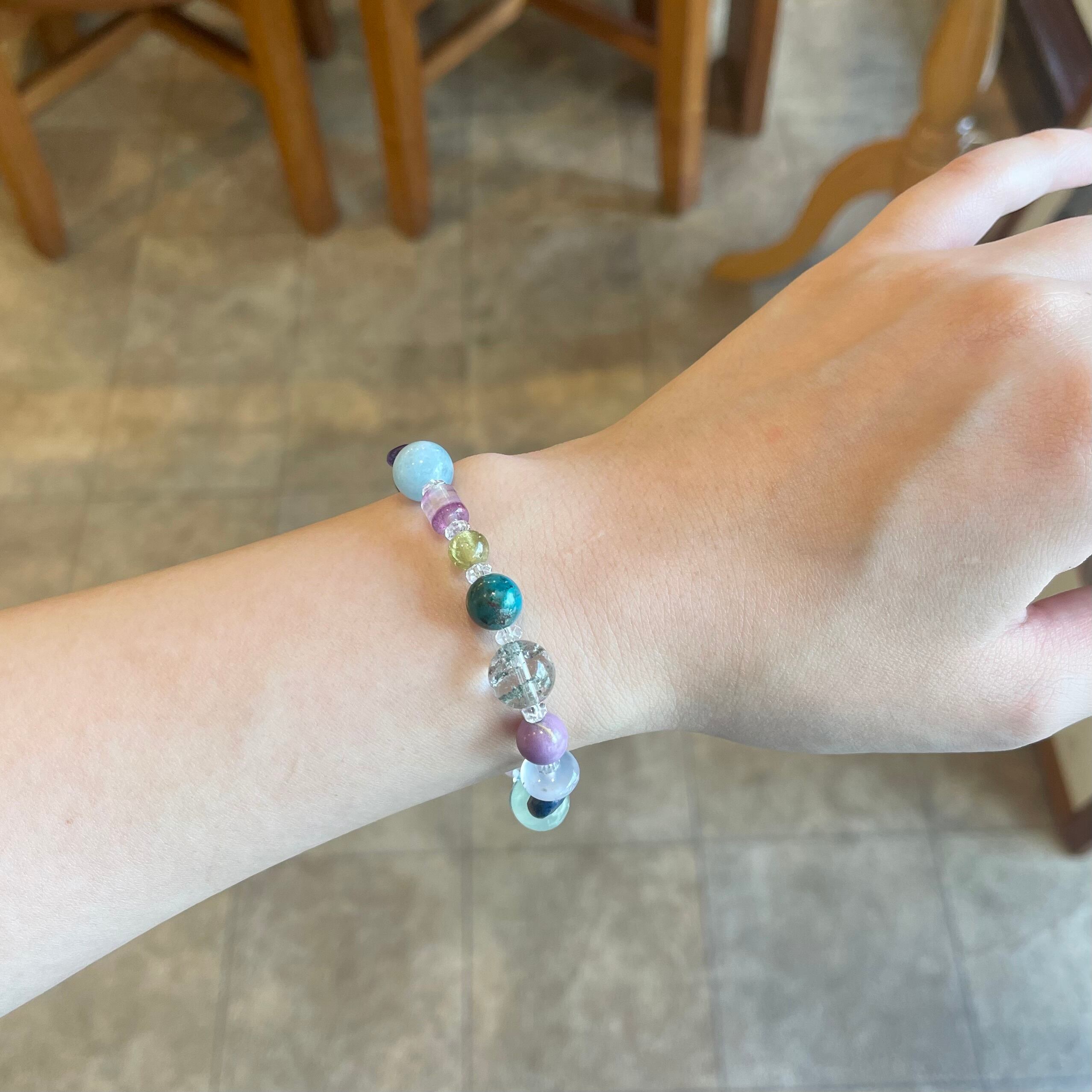 石 :水晶、ガーデンクォーツ、ホスホシデライト、カルセドニー、デュモルチェライト、プレナイト、ブルートパーズ、ディープローズ、ラピス、チャロアイト、スターアクアマリン、アマゾナイト、フローライト、マトリックスラズライト、アメシスト、アクアマリン、フローライト、グリーンガーネット、クリソコーラ