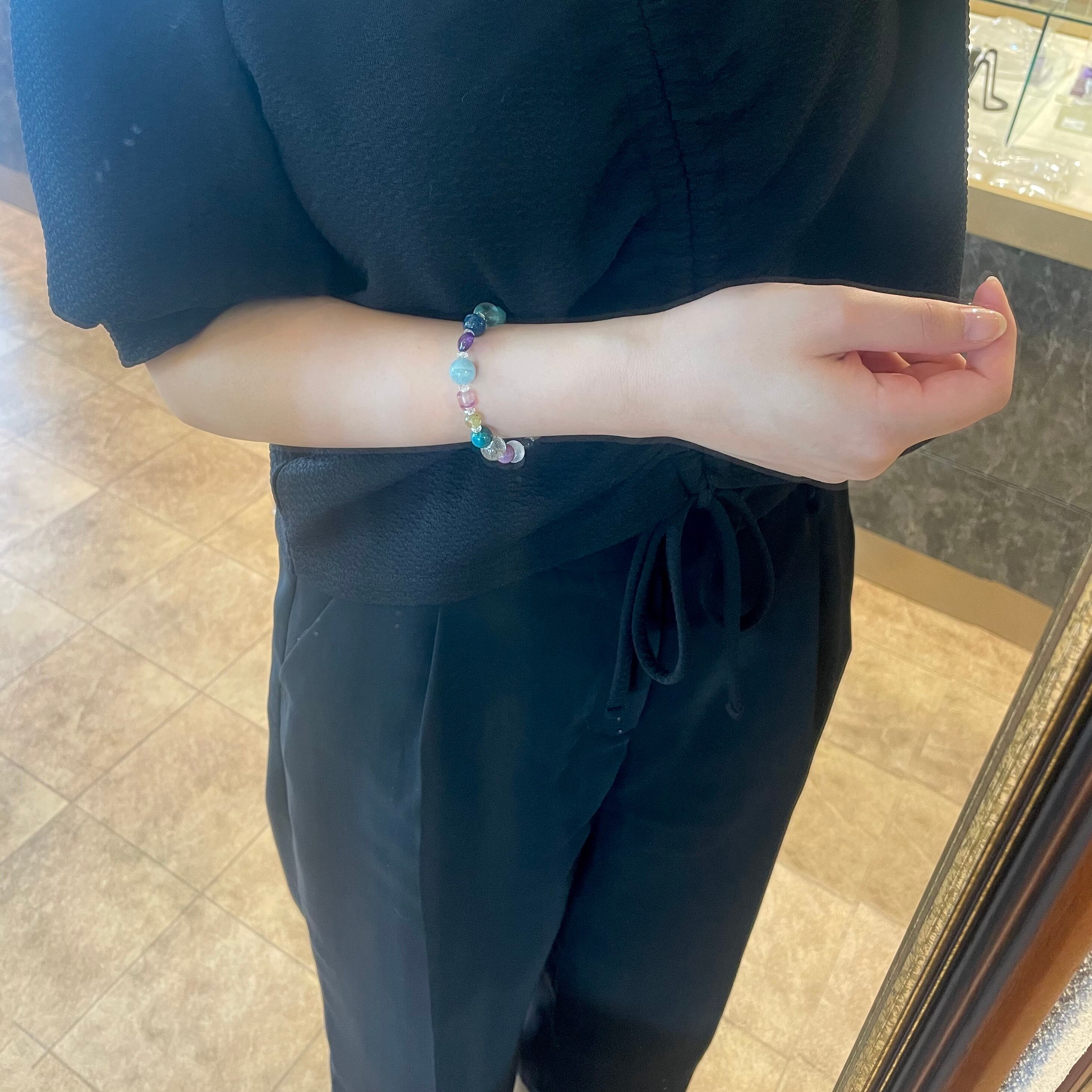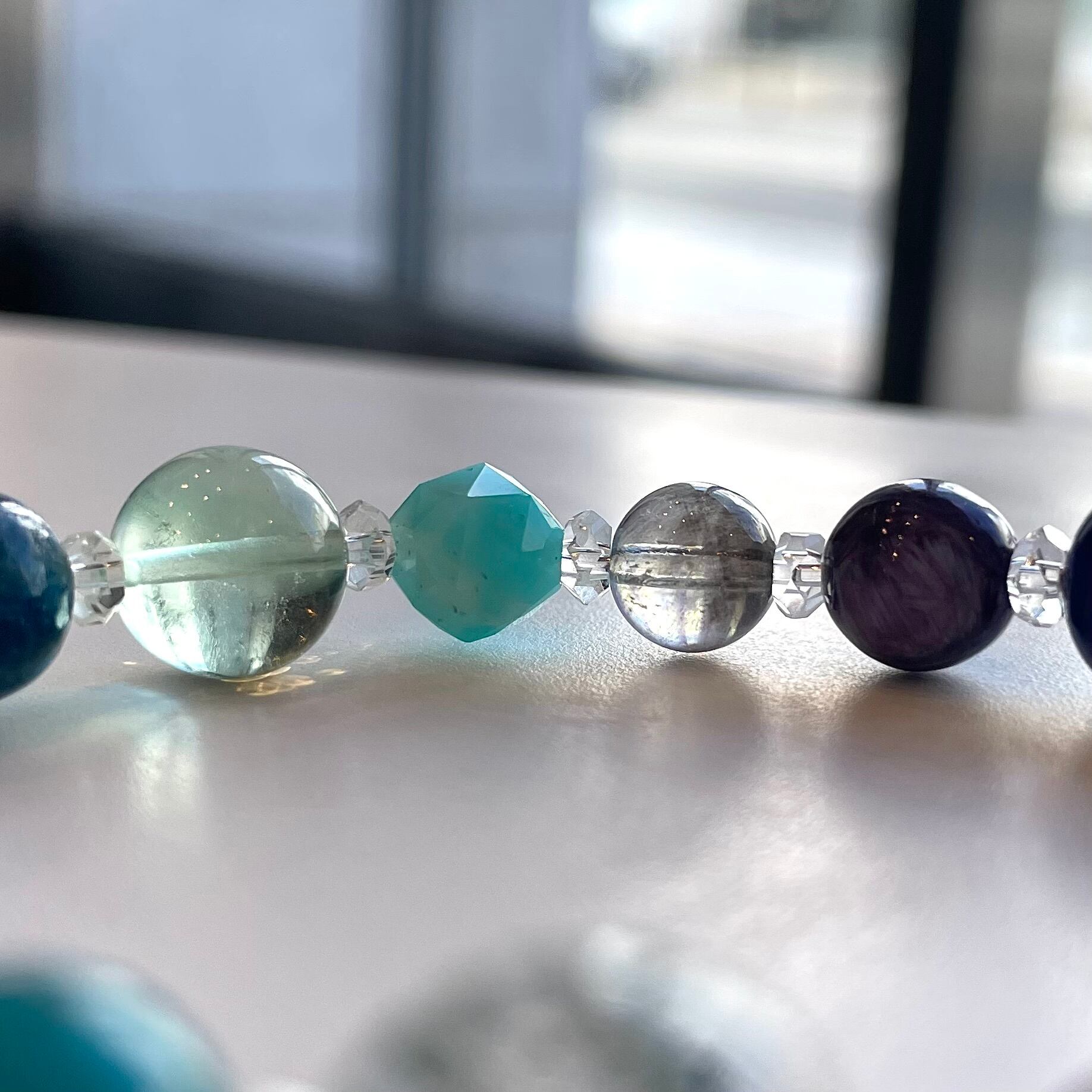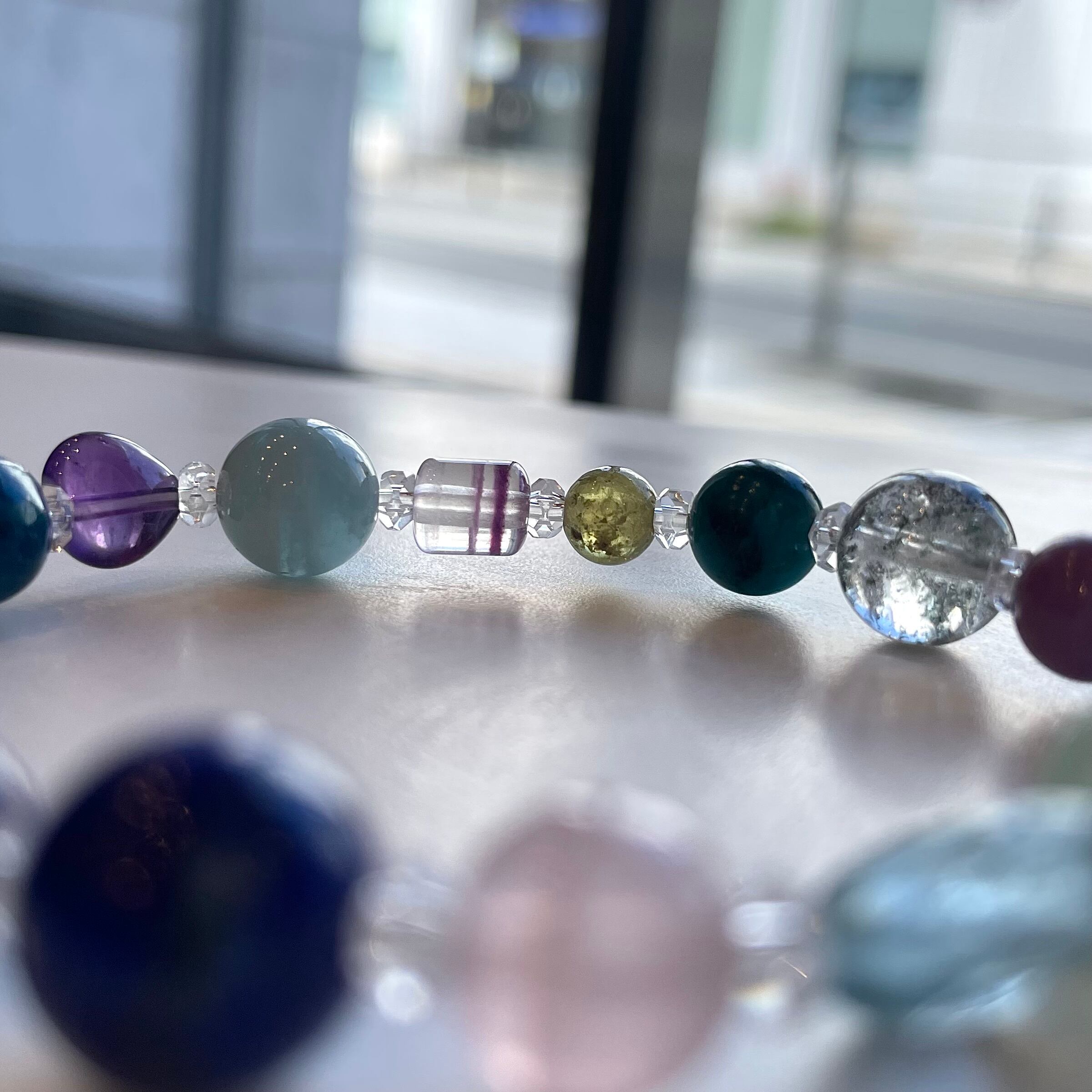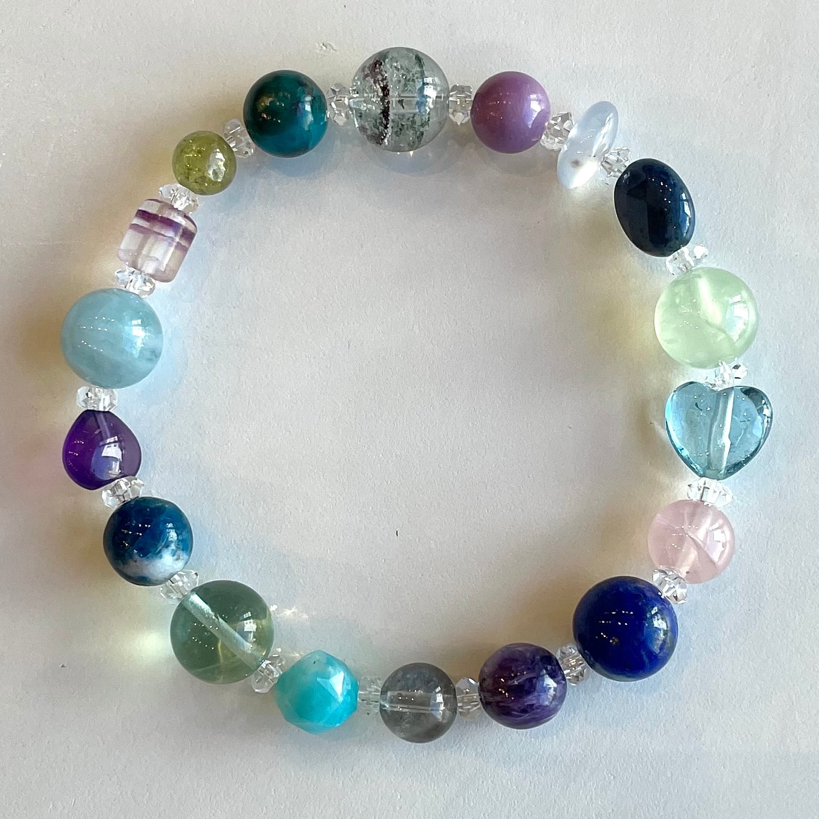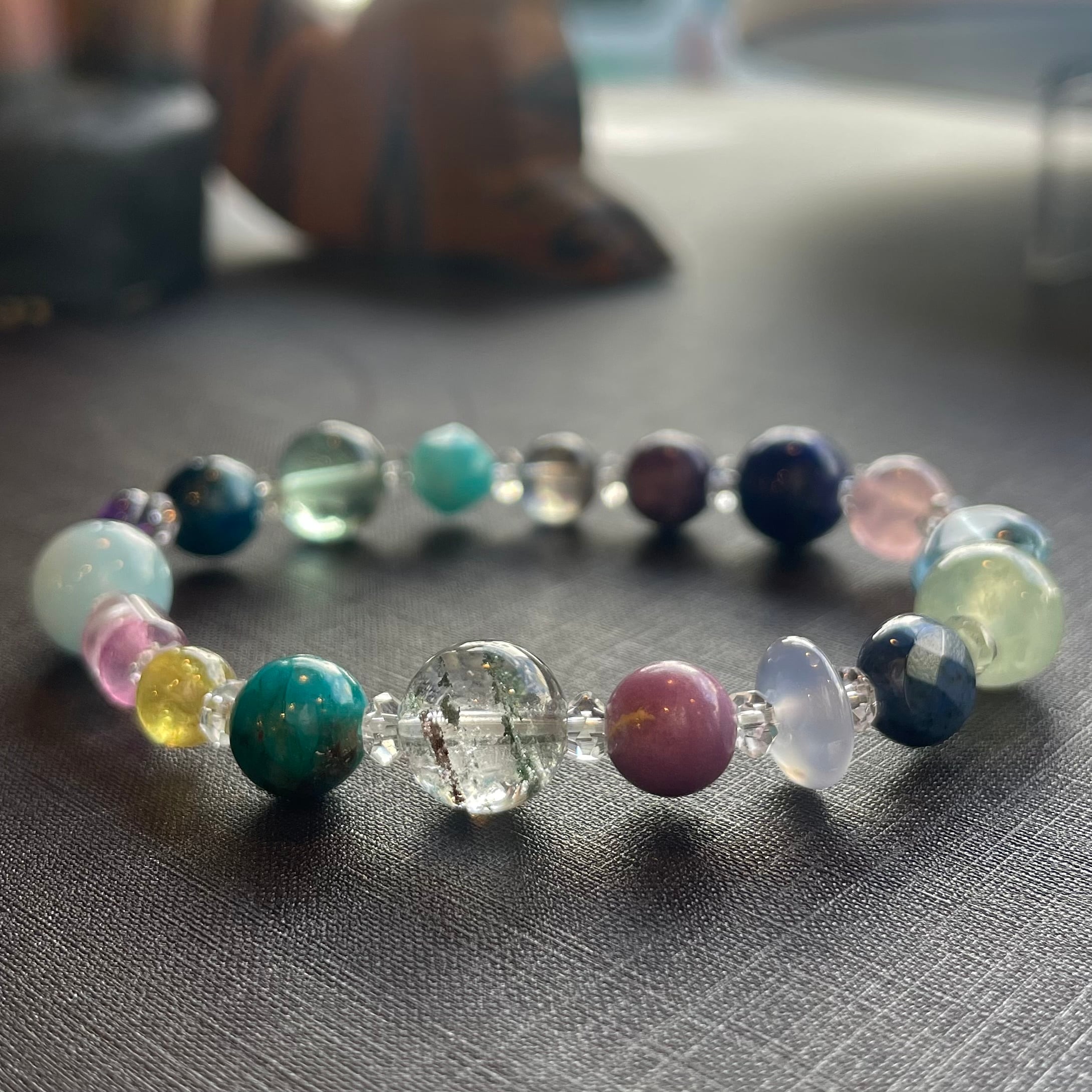 石 :水晶、ガーデンクォーツ、ホスホシデライト、カルセドニー、デュモルチェライト、プレナイト、ブルートパーズ、ディープローズ、ラピス、チャロアイト、スターアクアマリン、アマゾナイト、フローライト、マトリックスラズライト、アメシスト、アクアマリン、フローライト、グリーンガーネット、クリソコーラ