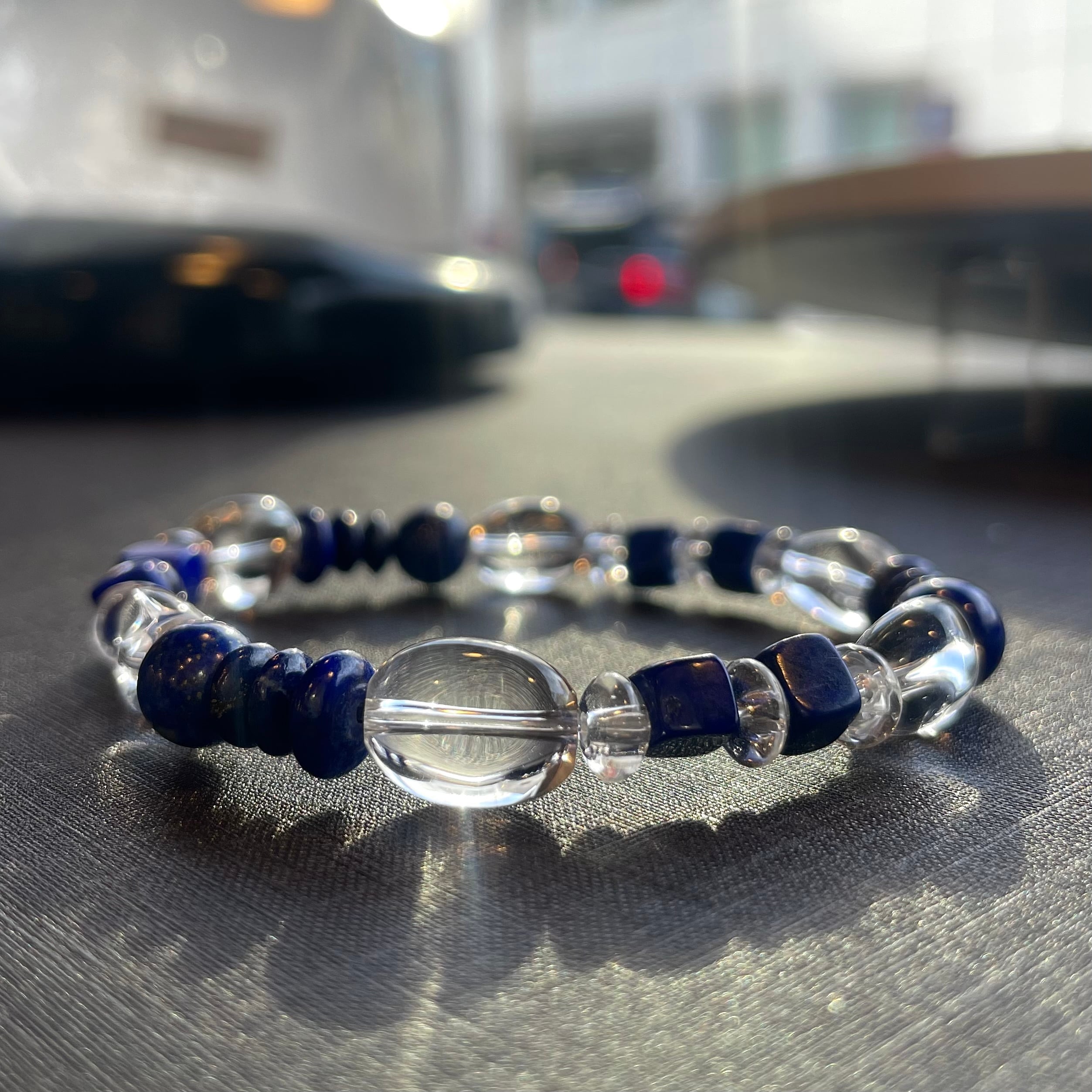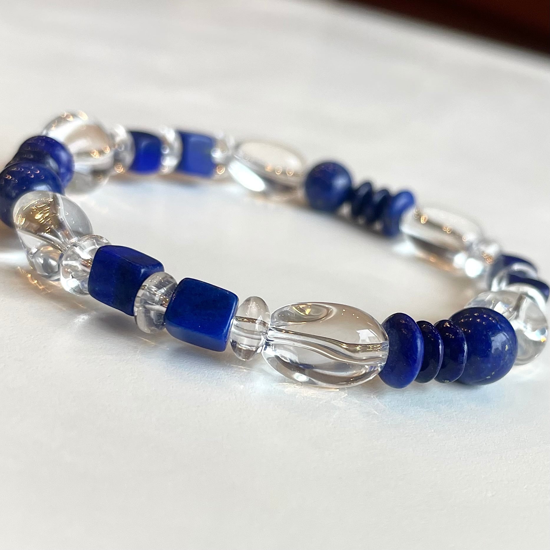いろいろな形のラピスを使用した、エッジが効いたブレスレット。