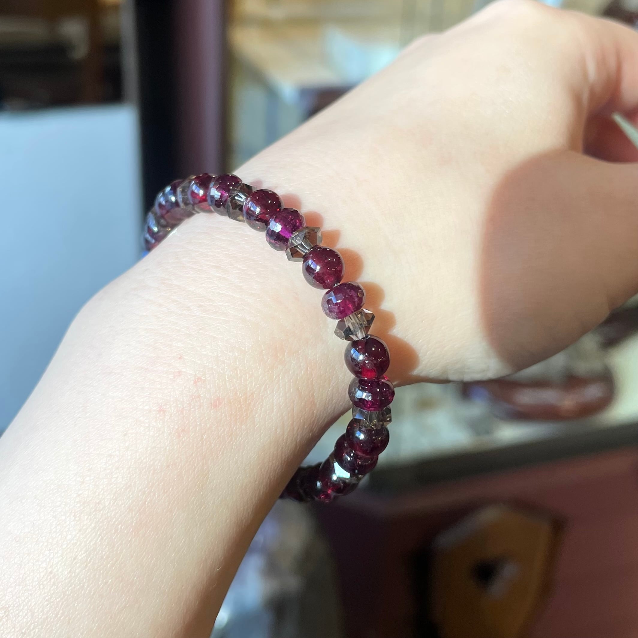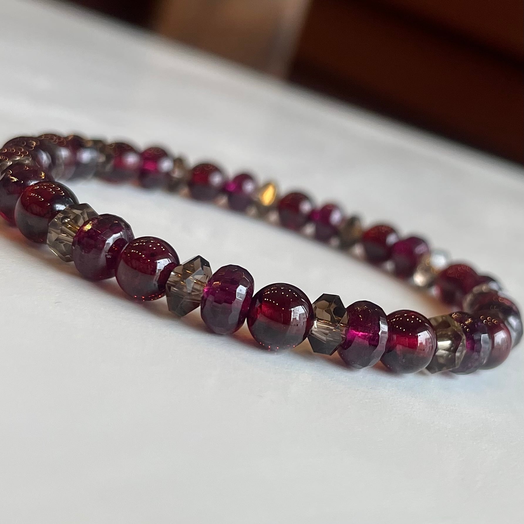 赤とピンクのガーネットをスモーキークォーツと合わせました。