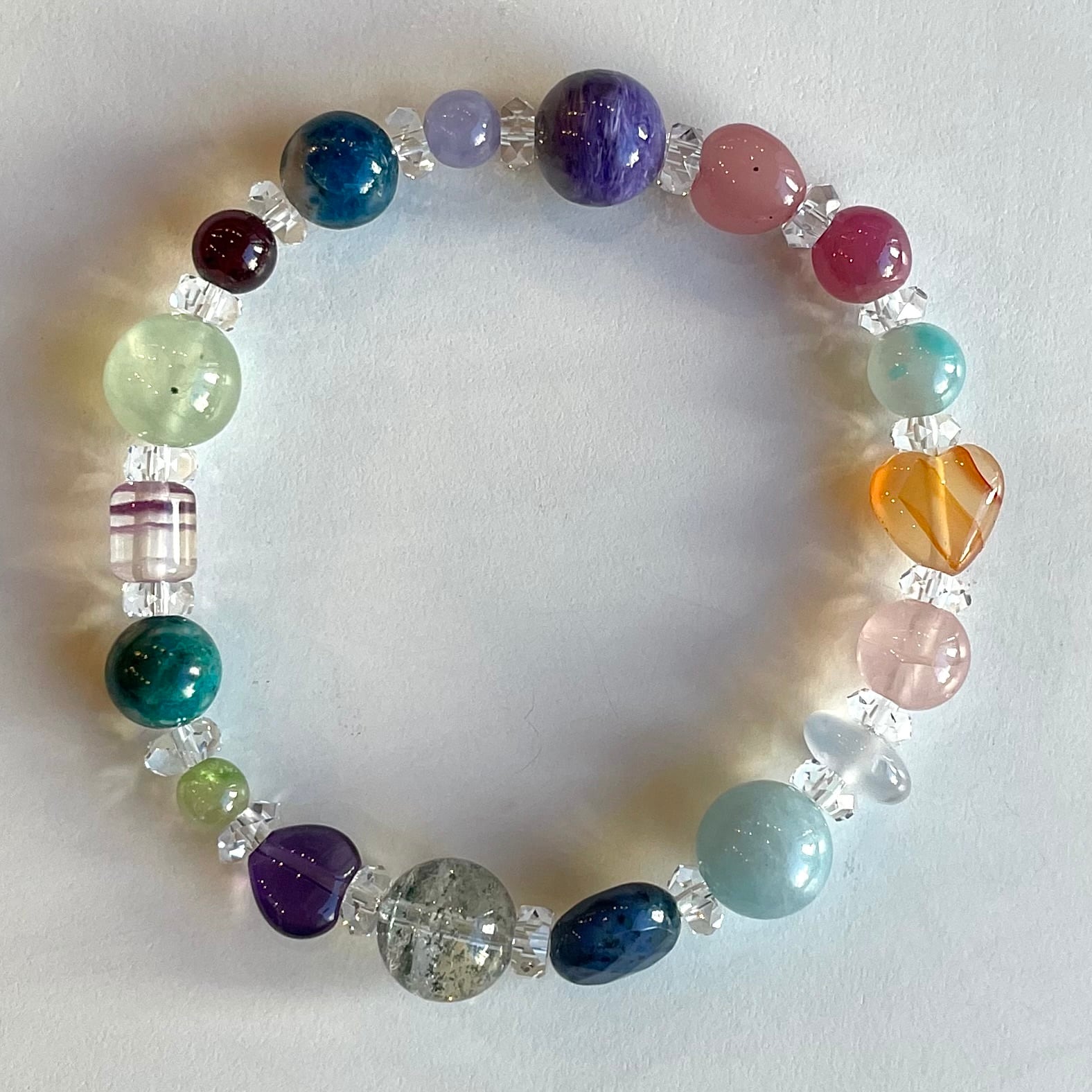 石 :チャロアイト、グァバクォーツ、ピンクサファイア、アマゾナイトインクォーツ、メノウ、ディープローズクォーツ、カルセドニー、アクアマリン、デュモルチェライト、ガーデンクォーツ、アメシスト、ガーネット、クリソコーラ、フローライト、プレナイト、マトリックスラズライト、ハックマナイト