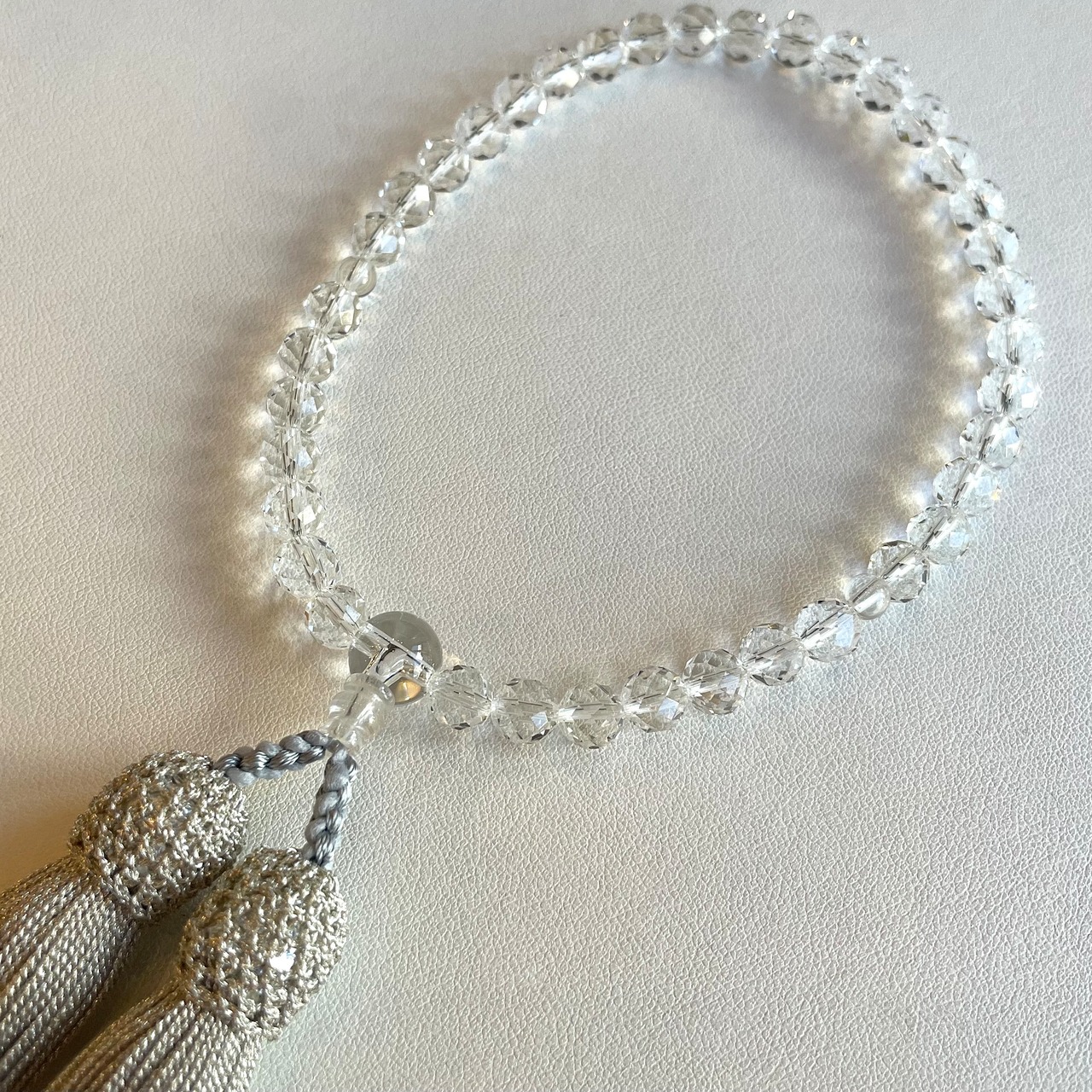カットの水晶に合わせてシルバーの房を付け、格調高いお数珠をつくりました。